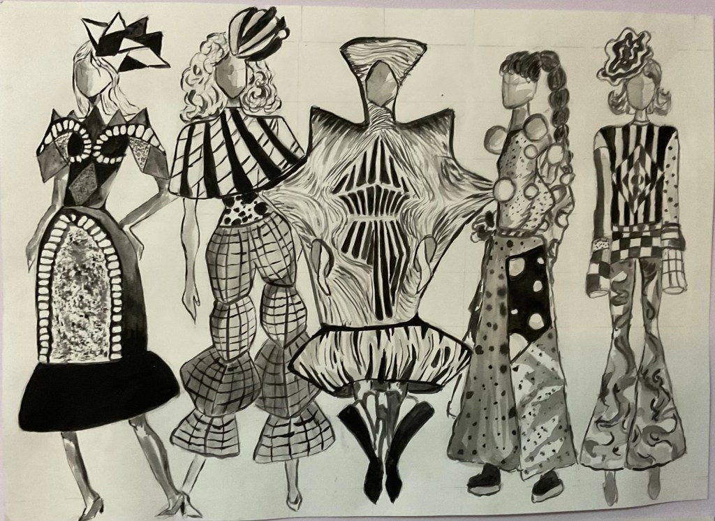 This painting features five unique figures in bold, monochromatic outfits with striking patterns and abstract designs. It blends fashion and art, highlighting creativity through dynamic textures and exaggerated silhouettes.Let me know how you feel about it!